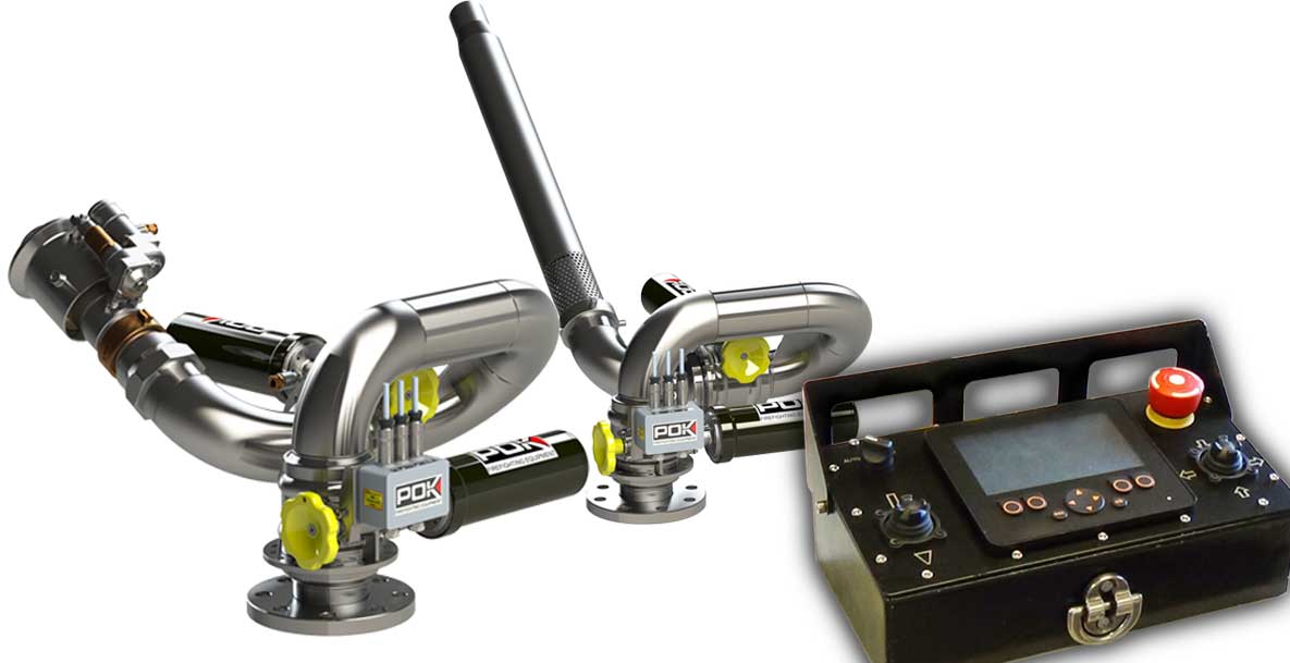 Le concept proposé par POK comprend la fourniture de deux canons à incendie eau ou eau/mousse (en acier inoxydable) pour chacune des fosses, avec diffuseur, entièrement motorisés. Ces canons sont pilotés à l’aide d’un pupitre de commande installé dans la salle de commandes du pontier permettant un contrôle manuel de chacun des canons ou un contrôle automatique de ces derniers en cas de détection d’un incendie. Même si la commande se fait à vue, un afficheur graphique de 4,3″ permet d’indiquer la position en temps réel du canon commandé.